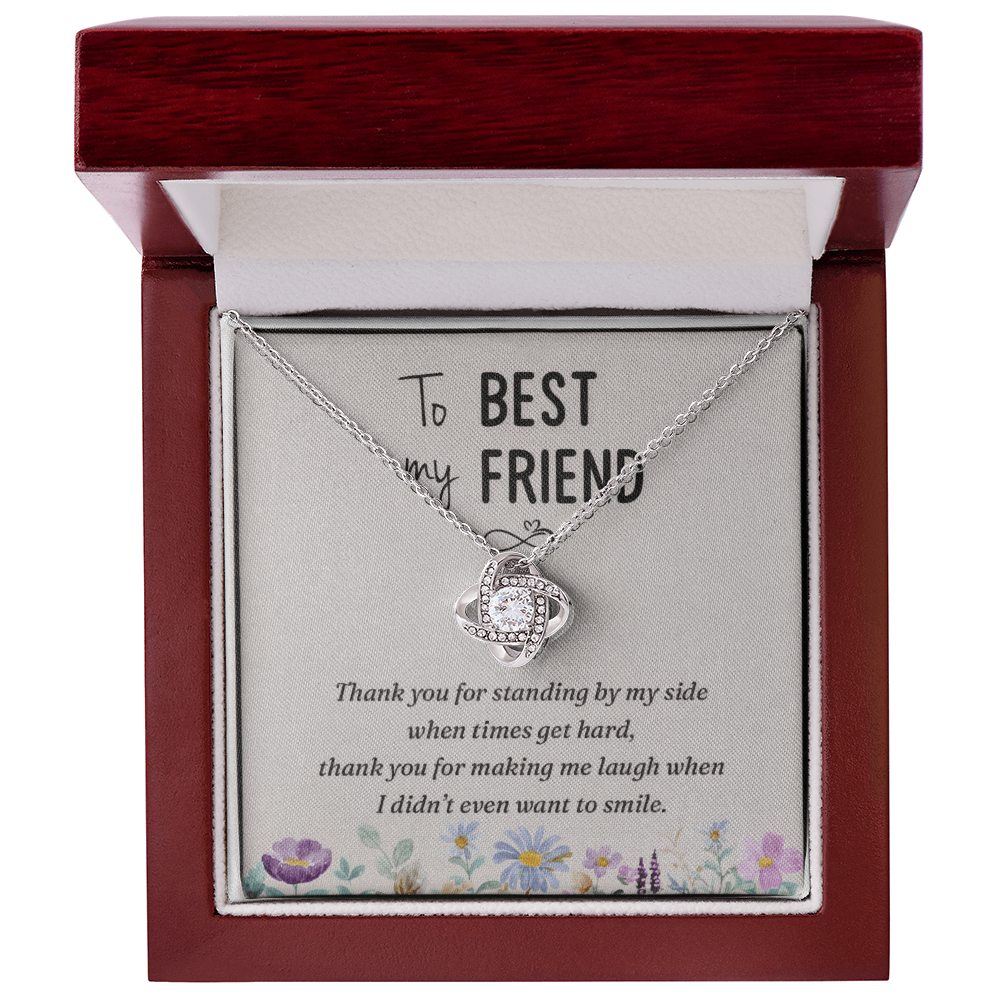Celebrate the friend who’s always there. The Love Knot Necklace symbolizes an unbreakable bond between two souls, sparkling with premium cubic zirconia and presented on a heartfelt message card: “To my best friend… thank you for standing by my side when times get hard, and for making me laugh when I didn’t even want to smile.” It’s the perfect thank-you, birthday, or just-because gift.